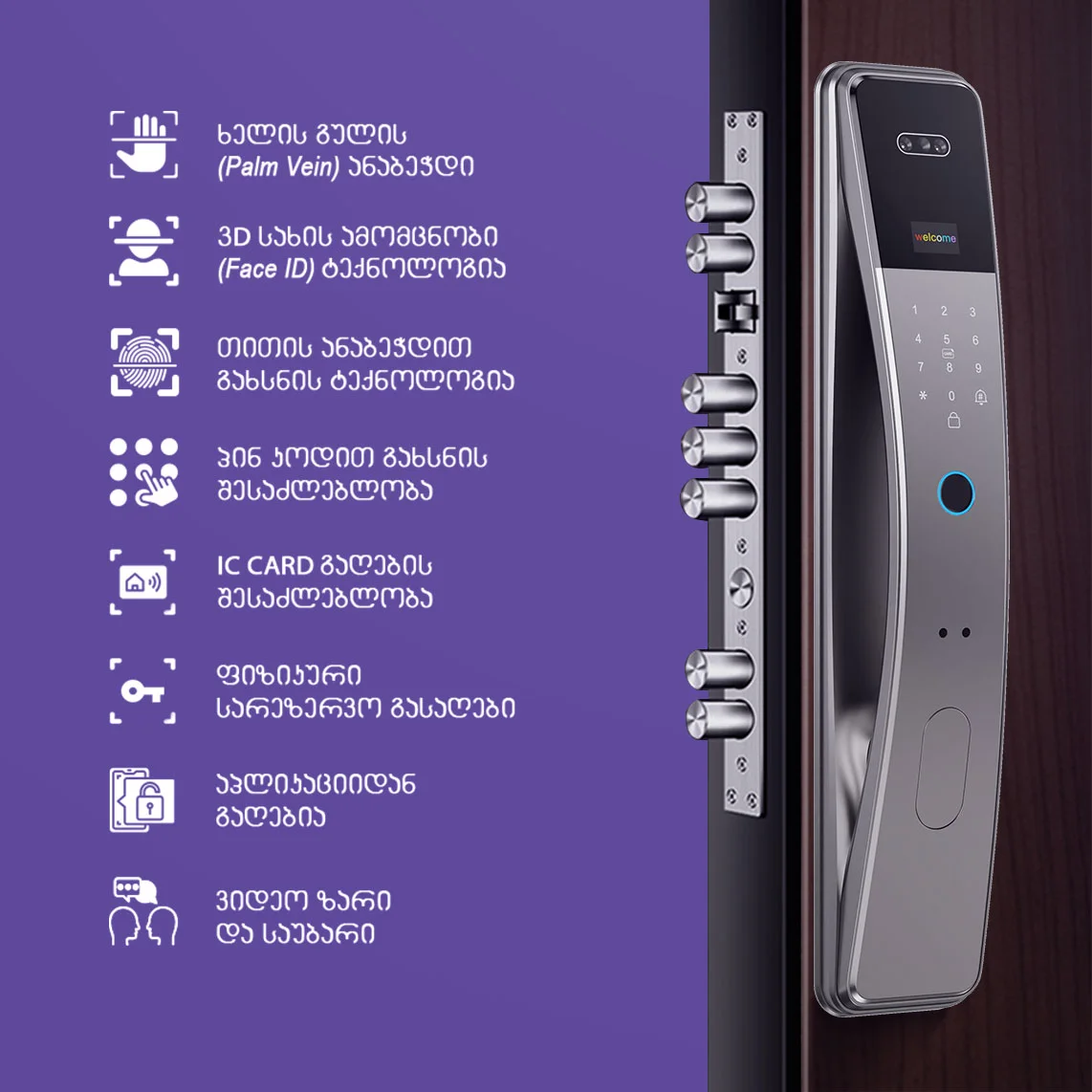 სმარტ-საკეტი Face ID და ვიდეო ინტერკომის ფუნქციით. უზრუნველყოფს მაქსიმალურ დაცვას ბიომეტრიული სკანირებით და გაღების 7 სხვადასხვა მეთოდით.